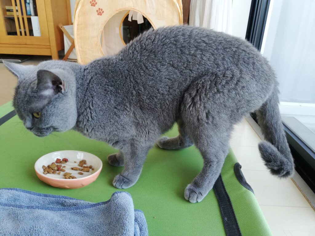 Today, Madam Dorothy’s snack is on the cot that the CEO placed by the living room window. There’s some extra-tasty kibble, so Madam Dorothy is excited, but the location is a bit awkward. Her bunched-over posture is so adorable that the CEO can’t help but take a series of phots.