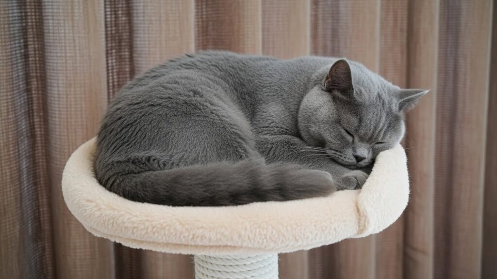 Madam Dorothy waking up on top of the cat tower, stretching her front and back paws wide, rounding her back and tail, and letting out a huge, satisfying wake-up yawn.