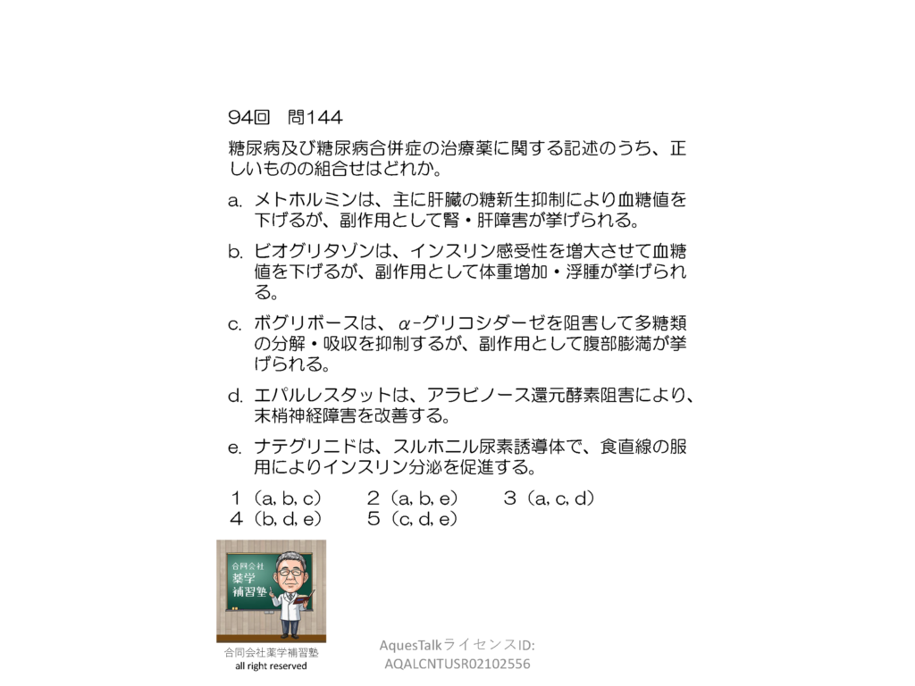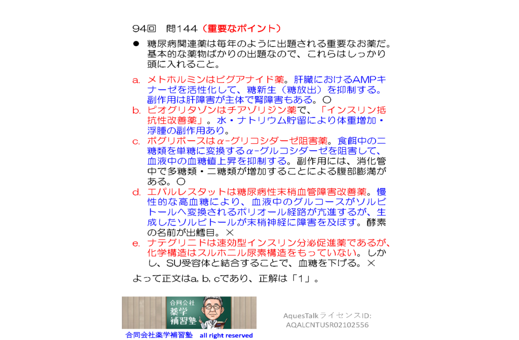 薬剤師国家試験・薬理学関連問題(旧課程;94回問144:糖尿病関連薬)のゆっくり解説/GNBslide付(YouTube:260204)