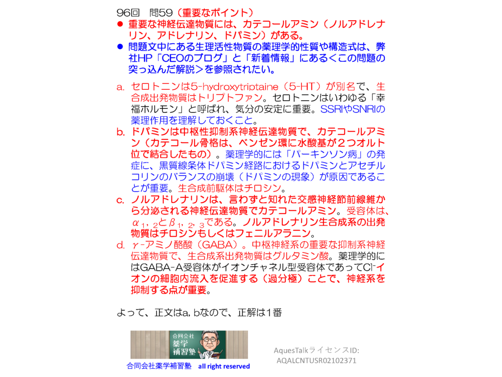 YouTubeショート動画の解説スライドおよび<この問題の突っ込んだ解説>にある解説スライドは、薬学部の現役学生の方、次回の薬剤師国家試験を受験される予定の方はダウンロードしてお使いになっていただいて構いません。なお、大学教育関係者の方、薬剤師国家試験受験予備校関係者の方でスライドのダウンロードご希望の方は、本HPの「お問い合わせホーム」から弊社宛、事前にご連絡ください。また弊社HPトップページには、2024年10月1日から「学習法カウンセリング講座を始めました(新規開講授業に関するお知らせ)」を掲載しています。是非ご検討ください。