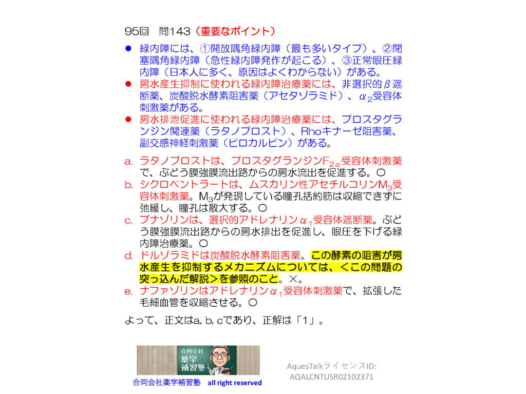 YouTubeショート動画の解説スライドおよび<この問題の突っ込んだ解説>にある解説スライドは、薬学部の現役学生の方、次回の薬剤師国家試験を受験される予定の方はダウンロードしてお使いになっていただいて構いません。なお、大学教育関係者の方、薬剤師国家試験受験予備校関係者の方でスライドのダウンロードご希望の方は、本HPの「お問い合わせホーム」から弊社宛、事前にご連絡ください。また薬物動態学に限らず、CBTや卒業試験、国家試験に向けた「学習法カウンセリング講座」も開講しています(弊社HPのトップページをご覧ください)「自分の勉強方法が正しいのかどうか今一つ不安だ」というような学生さんは、熟練した指導者による早めのカウンセリングが非常に効果的です。是非一度ご検討ください。