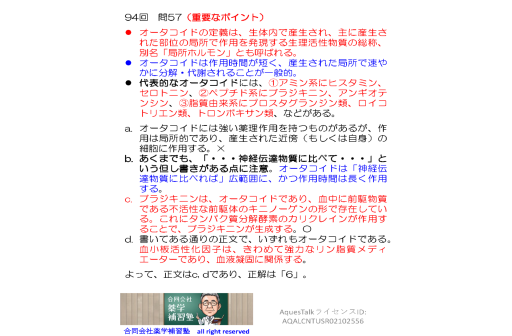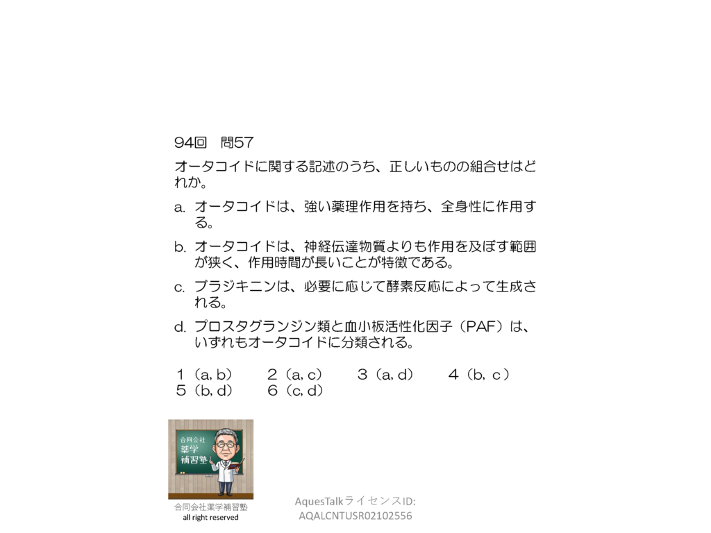 YouTubeショート動画の解説スライドおよび<この問題の突っ込んだ解説>にある解説スライドは、薬学部の現役学生の方、次回の薬剤師国家試験を受験される予定の方はダウンロードしてお使いになっていただいて構いません。なお、大学教育関係者の方、薬剤師国家試験受験予備校関係者の方でスライドのダウンロードご希望の方は、本HPの「お問い合わせホーム」から弊社宛、事前にご連絡ください。また薬物動態学に限らず、CBTや卒業試験、国家試験に向けた「学習法カウンセリング講座」も開講しています(弊社HPのトップページをご覧ください)。「自分の勉強方法が正しいのかどうか今一つ不安だ」というような学生さんは、熟練した指導者による早めのカウンセリングが非常に効果的です。是非一度ご検討ください。