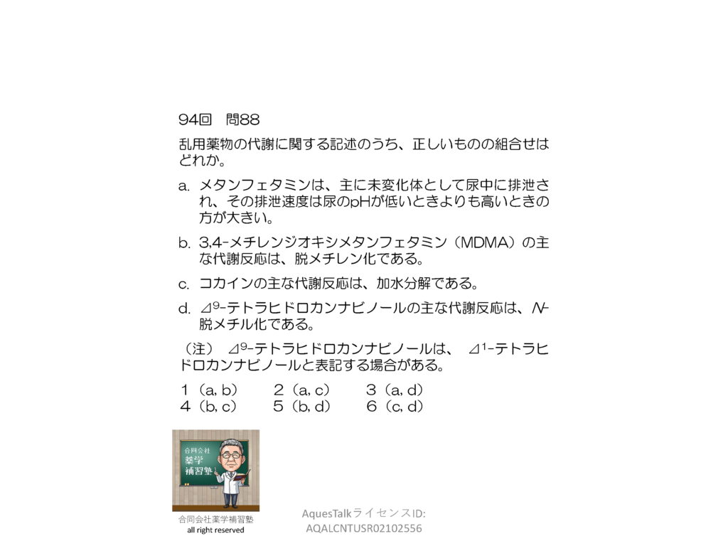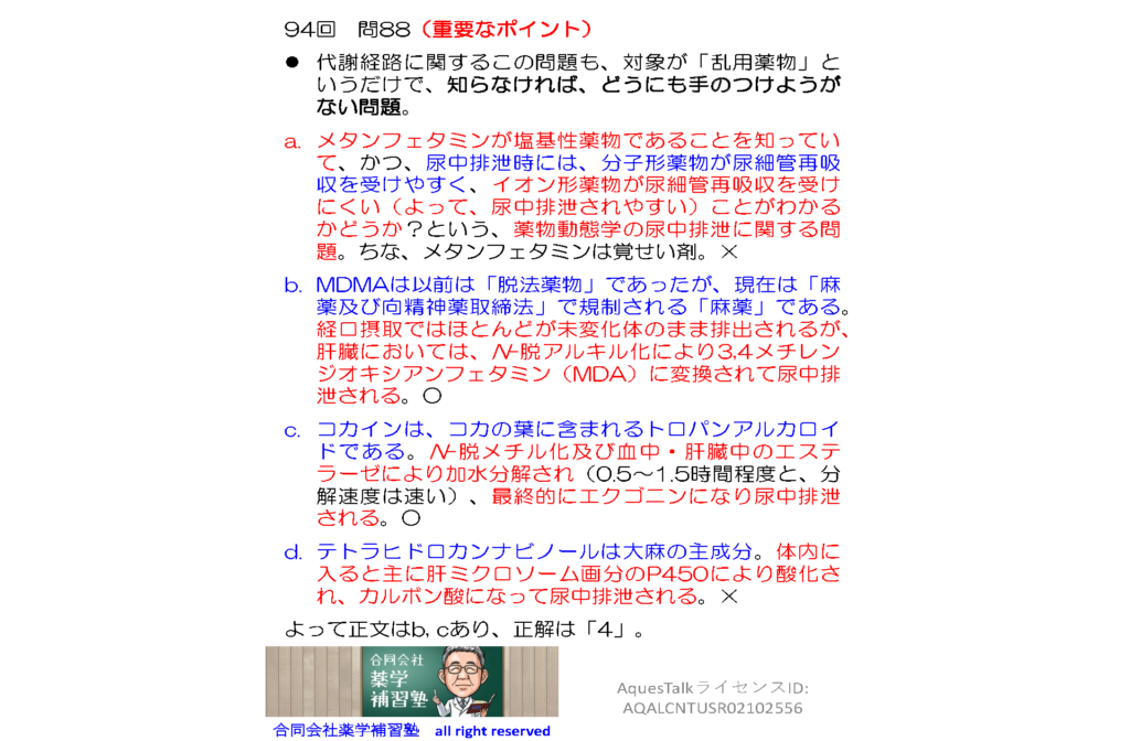 YouTubeショート動画の解説スライドおよび<この問題の突っ込んだ解説>にある解説スライドは、薬学部の現役学生の方、次回の薬剤師国家試験を受験される予定の方はダウンロードしてお使いになっていただいて構いません。なお、大学教育関係者の方、薬剤師国家試験受験予備校関係者の方でスライドのダウンロードご希望の方は、本HPの「お問い合わせホーム」から弊社宛、事前にご連絡ください。また薬物動態学に限らず、CBTや卒業試験、国家試験に向けた「学習法カウンセリング講座」も開講しています(弊社HPのトップページをご覧ください)。「自分の勉強方法が正しいのかどうか今一つ不安だ」というような学生さんは、熟練した指導者による早めのカウンセリングが非常に効果的です。是非一度ご検討ください。