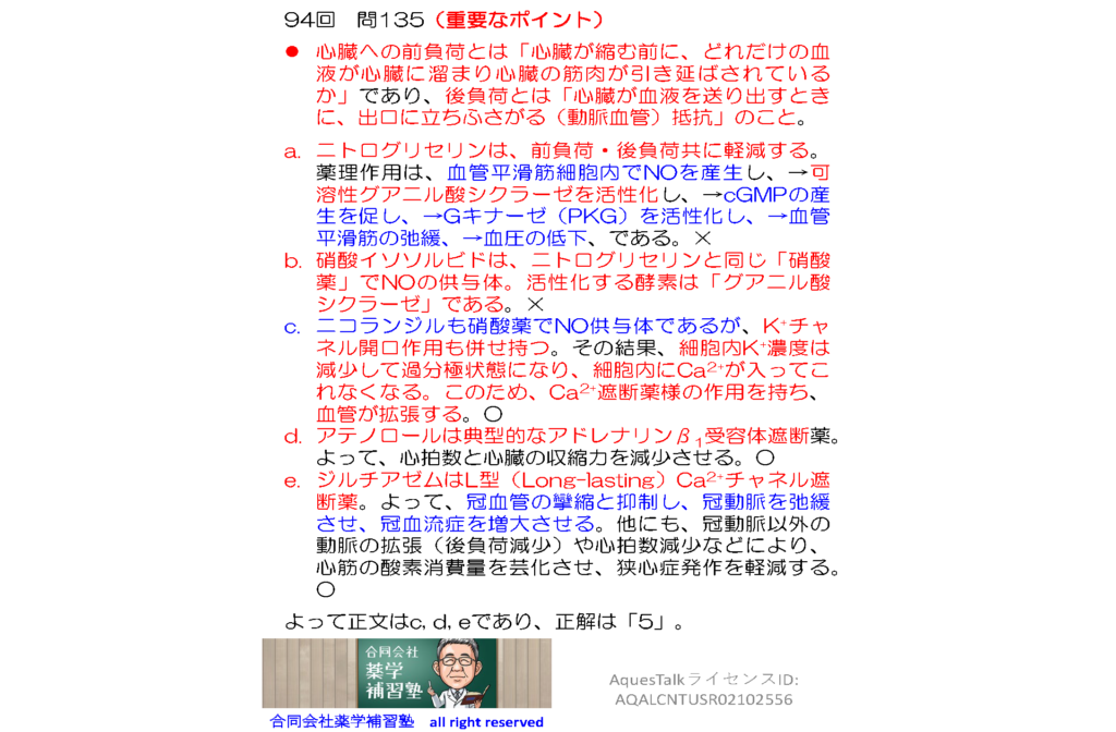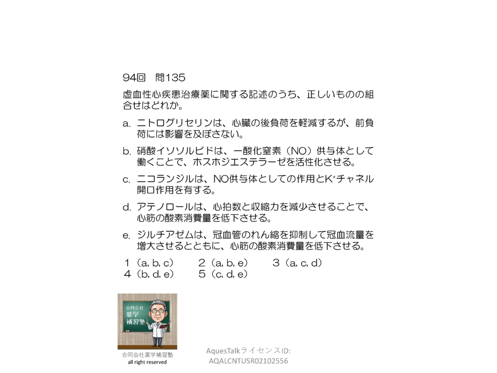 薬剤師国家試験・薬理学関連問題(旧課程;94回問135:虚血性心疾患治療薬)のゆっくりショート解説w/NBslide(YouTubeショート:2601117)